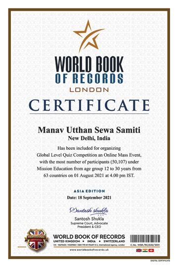 We bagged World Records from UNIVERSAL AMAZING WORLD RECORD and WORLD BOOK OF RECORDS LONDON in the category of conducting "Largest Online Quiz". Total 52396 people registered for the Quiz & 50107 people participated in Quiz From 63 Countries across the Globe.